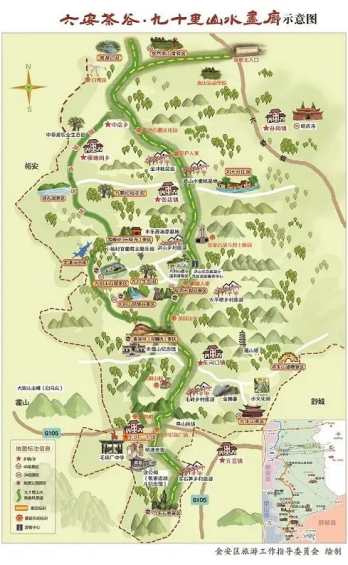 在距六安市主城区约6公里的南端,从中店镇悠然南山度假区至毛坦厂镇,沿省道六东路90余华里,一路环境优美、山清水秀、景色怡人、如诗如画,故称九十里山水画廊。