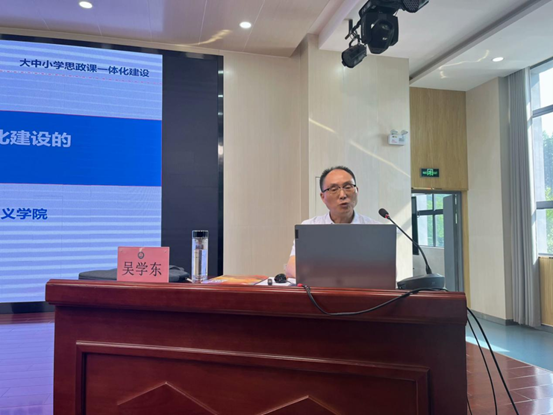 在专家授课环节,皖西学院马克思主义学院院长吴学东同志以《大中小学思政课一体化建设的实践与思考》为题作专题辅导报告。吴学东同志围绕新时代思政课改革创新要求,系统回顾了我国大中小学思政课一体化建设的历程和大中小学思政课一体化建设的实践探索成效,分析了当下大中小学思政课一体化建设的现实困境,以及对大中小学思政课一体化建设的思考。吴院长指出,只有明确思政课一体化的历史、现状和未来,才能在纷繁复杂的迷障中找准航标,在具体的课程实施中培根铸魂、立德树人。吴院长高屋建瓴颇具理论深度和现实温度的阐释,为我区思政课一体化建设提供了理论支撑和实践指引。