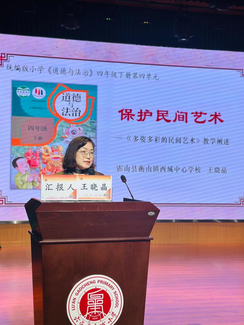 紧接着是来自霍山衡山镇西城中心校王晓晶老师带来的四年级下册第四单元《保护民间艺术》的说课活动。王老师从民间艺术的现状与价值入手,引导学生认识民间艺术面临的挑战,激发学生保护民间艺术的责任感。通过小组讨论、资料收集和成果展示等环节,培养学生的合作能力和实践能力。在说课过程中,教师还注重联系实际生活,引导学生从身边小事做起,为保护民间艺术贡献自己的力量,体现了道德与法治课程的生活性和实践性。