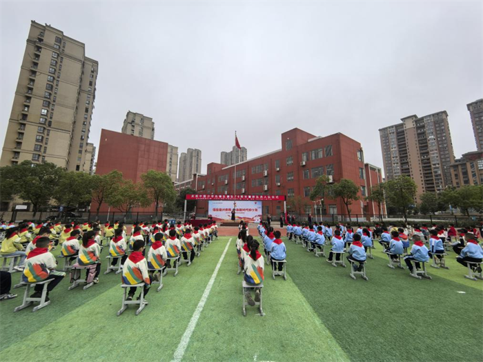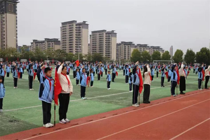 皋城小学、梅山路小学、人民路小学望城岗校区、人民路小学南山校区、清水河一小、城东小学、毛坦厂镇毛坦厂学校、三十铺镇第一小学西校区、鹏飞学校等多校关工委注重发挥仪式育人功能,通过庄严的升旗仪式、入队仪式、表彰仪式等,增强少先队员的组织归属感和荣誉感。在授红领巾仪式中,老队员为新队员佩戴红领巾,传递“传承责任”的信念;在宣誓环节,新队员高举右拳,立下了“热爱中国共产党,热爱祖国,热爱人民,好好学习,好好锻炼,准备着:为共产主义事业贡献力量”的铮铮誓言,许下了庄严承诺。通过党员教师、团员教师、少先队辅导员分别传递党旗、团旗、队旗,全体师生齐呼“红色旗帜,代代相传”的形式,将爱党爱国情怀深深植根于孩子们心中。