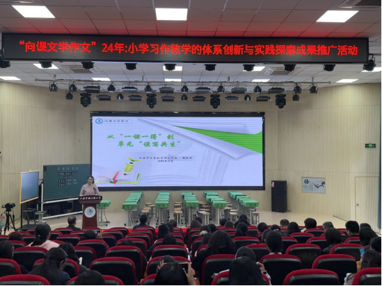 紧接着,梅山路小学正高级教师车福俊作了题为“向课文学作文”的成果专题报告。车老师深入阐释“向课文学作文”理念。他强调,课文是写作教学的核心载体,要以课文为本体,串联起读与写。阅读时,引导学生“为写而读”,解构提炼课文中的写作颗粒,像精准的细节刻画、鲜活的场景营造等,同时搭建“举三得法”的写作支架,助力学生掌握语言运用、结构搭建的技巧;写作时,践行“以读促写、以写促悟”,通过“反三迁移”开展实践创写,再经“反刍品鉴”实现读写升华,形成读写循环、共生共长的良性生态。报告系统梳理了“向课文学作文”模式从理念构建到课堂落地的全过程,通过丰富的案例、详实的数据和清晰的路径图,生动展示了如何从课文中挖掘写作资源、如何设计有效的写作任务、以及该模式在区域内多所学校实践后所带来的学生习作水平和教师教学能力的双提升,为在场教师提供了一套可复制、可操作的教学实践方案。