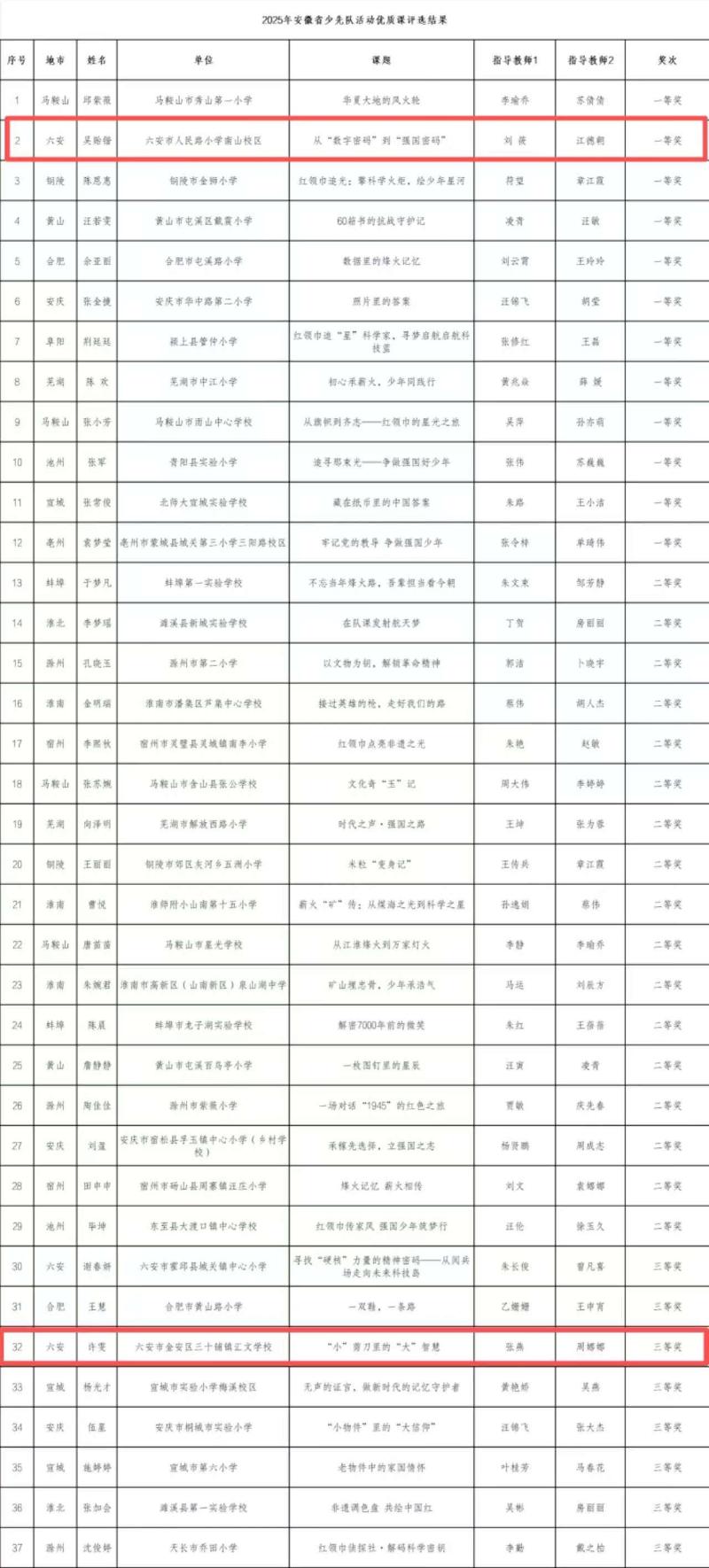 近日,在由共青团安徽省委、安徽省教育厅、安徽省少工委联合举办的全省少先队活动优质课评选活动中,金安区选派参赛的六安市人民路小学南山校区吴贻锴老师、六安市汇文学校许雯老师代表六安市参赛,凭借扎实的专业功底、创新的活动设计和出色的现场发挥,从全省16个地市的49名优秀少先队辅导员中脱颖而出,分别荣获一等奖和三等奖的优异成绩,展现了我区少先队辅导员卓越的风采与实力!