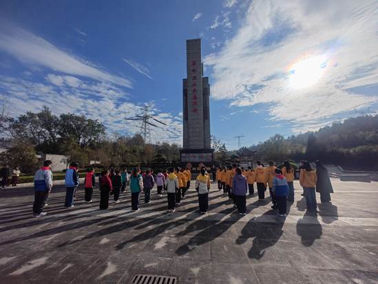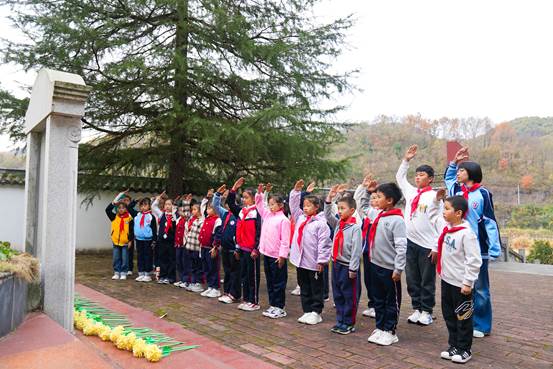 在毛坦厂中学,队员们在学校团委老师付稳稳的讲解中,深入了解学校的办学历史与文化底蕴,并在毛主席雕像前庄严宣誓,许下“时刻准备着”的少年誓言;在梁家冲烈士陵园,红领巾讲解员张嘉琪讲述发生在毛岭村的红军英烈事迹。队员们献上亲手制作的菊花,并与义务守墓42年的黄克胜老人交流,感悟坚守的力量。