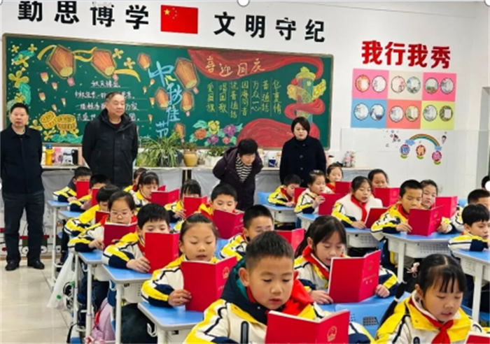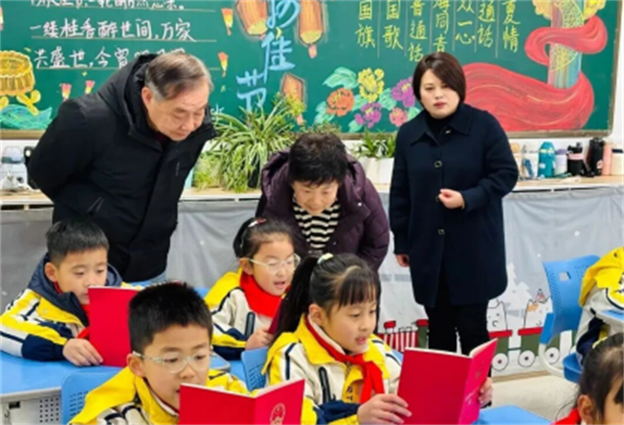 随后,调研组深入课堂,现场观看了孩子们的宪法晨读等宪法主题教育教学活动。李乔主任驻足聆听,与师生亲切交流,勉励同学们从小尊崇宪法、学习宪法、践行宪法,将宪法精神融入日常言行。他对皋城小学法治教育的扎实举措和育人成效给予充分肯定,认为学校工作载体丰富、形式生动、成效显著,充分体现了金安区教育系统关工委在青少年思想道德和法治教育方面的积极作为。