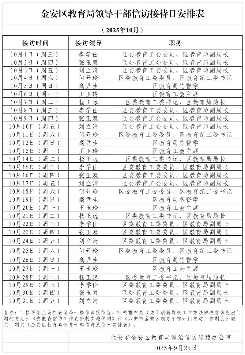 金安区教育局领导干部信访接待日安排表(2025年10月)