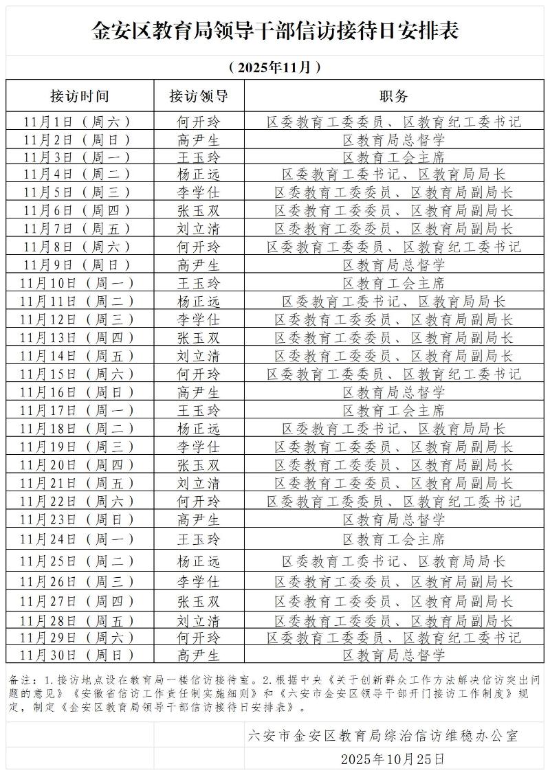 金安区教育局领导干部信访接待日安排表(2025年11月)