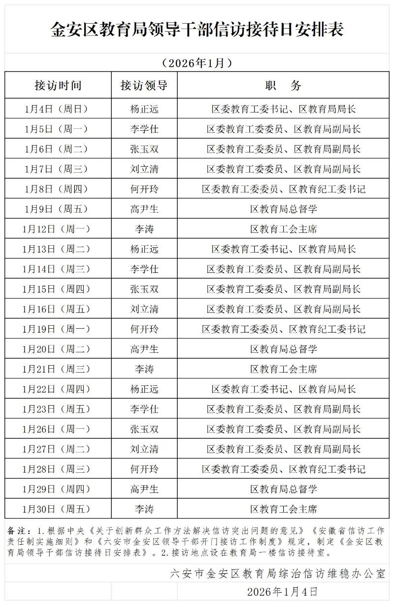 金安区教育局领导干部信访接待日安排表(2026年1月)