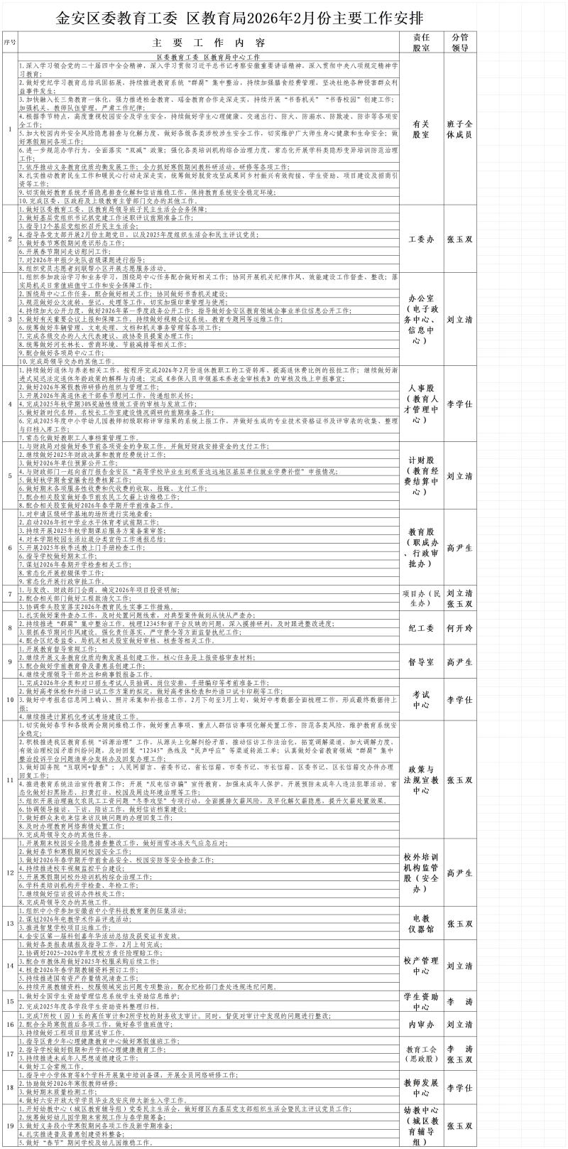 金安区委教育工委 区教育局2026年2月份主要工作安排