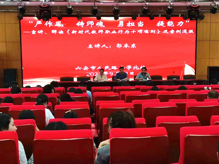 为进一步提升教师职业道德素养,强化育人使命和责任感,9月22日下午,人民路小学北校组织全体教师学习《新时代中小学教师职业行为十项准则》。该校校长严帮军主持,副校长郭本东主讲。
