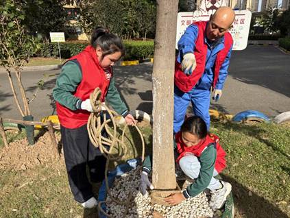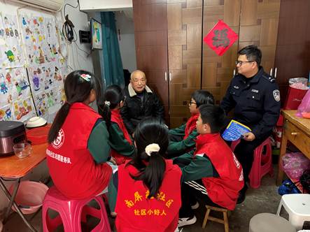 第一组学生化身“护绿小使者”,在园林师傅的指导下,细心为树木缠绕保温棉,助其御寒过冬。孩子们专注投入,以劳动表达对自然与环境的关爱;第二组学生担任“美德宣传员”,手持传单走进社区,用童声讲述敬老故事,将孝亲理念播撒至小区邻里,赢得居民们啧啧称赞;第三组学生默默担当“暖心帮手”,协助校区内的保洁员为行动不便的老人清理垃圾、传递物资,成为秋日中最美的风景;第四组学生在民警带领下,走进五保、空巢老人家中,陪伴聊天,倾听老人们忆苦思甜、为其捶背揉肩、表演节目,用纯真的笑语驱散老人们的孤寂,让温暖充盈每一个角落。