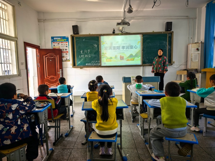 首先开展主题班会,知重阳传文化。活动伊始,各班级召开“爱满重阳 孝润童心”主题班会。课堂上,老师通过生动的课件,向同学们讲解重阳节的起源、习俗,如登高、赏菊、敬老等文化内涵。孩子们认真聆听,在知识的浸润中,对“重阳敬老”的传统有了深刻认知。