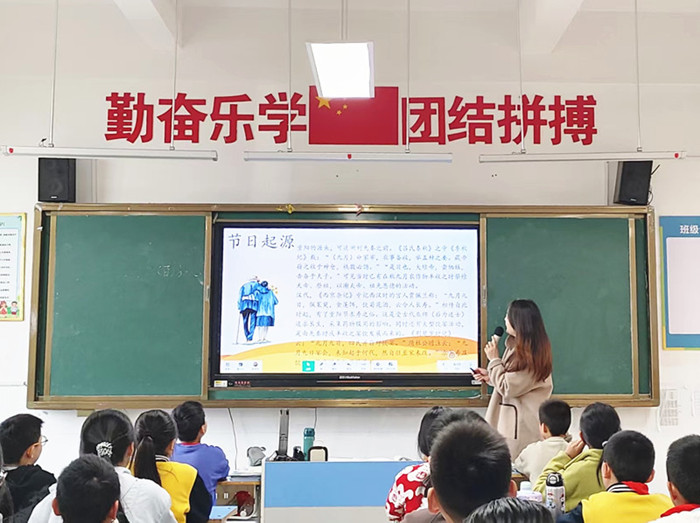 队会课围绕“节日、习俗、传说、诗词”等方面展开。各中队辅导员借助动画短片和趣味故事,追溯重阳节的起源:从战国时期“季秋之月,敬老养老”的礼制,到汉代“登高避灾”的民俗传说,再到如今“敬老节”的时代内涵。“重阳节要吃重阳糕、饮菊花酒,咱还有给长辈送‘寿桃’的传统习俗呢!”在习俗分享环节,队员们化身“小小民俗观察员”,有的带来了亲手绘制的菊花手抄报,有的分享了帮爷爷奶奶捶背的温馨照片,还有的现场演示了为长辈敬茶的礼仪动作。此外,辅导员还向队员们讲述了东汉时期桓景为民除害的神话传说,这一传说不仅解释了重阳节的起源,更让队员们感受到古人对自然力量的敬畏与战胜灾难的智慧。最后,辅导员老师带领队员们品读王维《九月九日忆山东兄弟》等重阳诗词,从“茱萸”“登高”的意象里,读懂古人对亲人的思念,也体会到“敬老孝亲”是刻在中华儿女血脉里的情感。