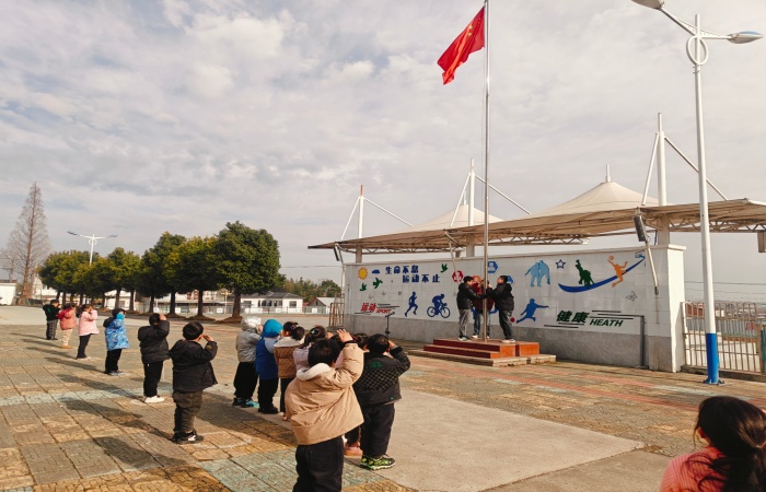 “起来!不愿做奴隶的人们……”当激昂的旋律响彻校园,全体师幼行注目礼,稚嫩的童声与清朗的少年音、沉稳的教师声交织在一起,汇成了对祖国最真挚的礼赞。鲜艳的五星红旗在微风中冉冉升起,飘扬在操场的上空。孩子们仰望着迎风招展的国旗,稚嫩的脸庞上洋溢着自豪与崇敬。升旗仪式结束后,汪老师还向孩子们讲解了国旗的含义,引导孩子们认识国旗、尊重国旗,将爱国的种子悄悄播撒在他们的心田。