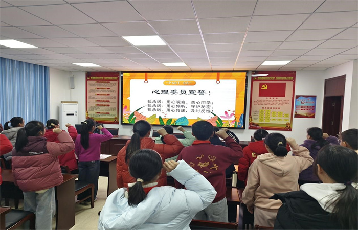 培训结束后,班级心理委员聘任仪式正式开启。全体新任心理委员庄严宣誓:“我承诺:用心观察,关心同学;用心倾听,守护秘密;用心传递,及时反馈!”铿锵的誓言彰显了同学们承担这份责任的决心。