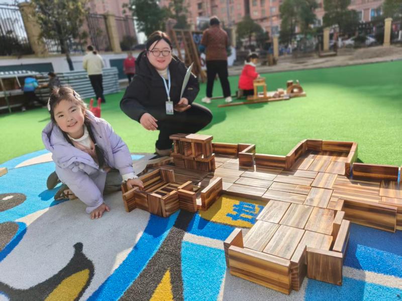 最受孩子们期待的,当属户外自主游戏环节。幼儿园充分践行安吉游戏理念,为孩子们准备了碳化积木、轮胎、滚筒、攀爬架等丰富的游戏材料。在户外场地,孩子们自由组队、自主选择游戏项目:有的三五成群合作搭建碳化积木,你搬我垒,共同构思搭建出“小城堡”“高塔”;有的蹲在地上滚着轮胎追逐嬉戏,或是趴在滚筒上练习平衡,玩得不亦乐乎;还有的勇敢地爬上攀爬架,在垫子的保护下挑战自我,展现出满满的活力。部分家长也主动参与进来,和孩子一起搭建积木,陪着孩子攀爬探索,在亲密互动中感受孩子的奇思妙想。操场上回荡着家长和孩子们的欢声笑语,家长们也沉浸式地感受着这份专属于孩子的简单快乐。