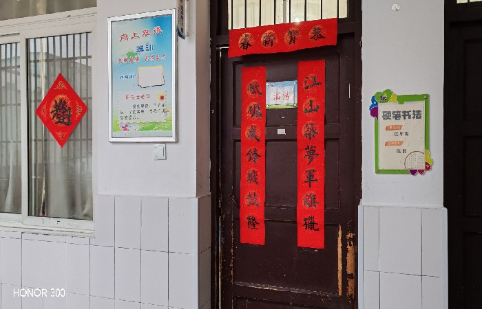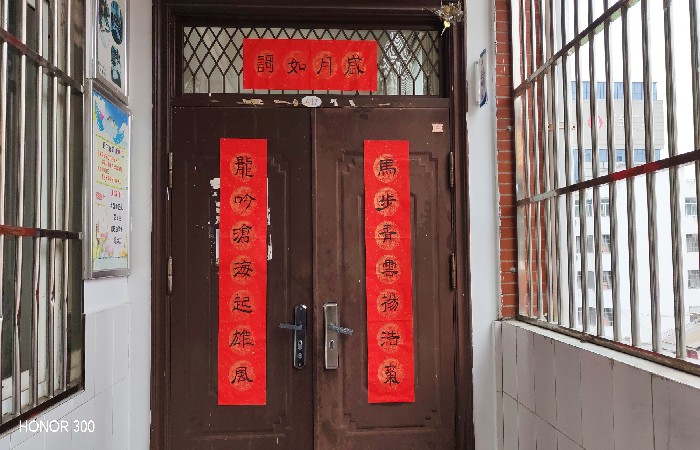 学生代表挥毫泼墨,一幅幅字迹工整、寓意吉祥的春联跃然纸上,墨香与年味交织。各班级“春联张贴小队”在班主任带领下分工协作,清理墙面、对齐粘贴,动作间饱含对新年的期盼。老师们同步讲解春联起源、平仄规律及张贴礼仪,让学生在动手实践中深化文化理解,红彤彤的春联为校园披上喜庆盛装。