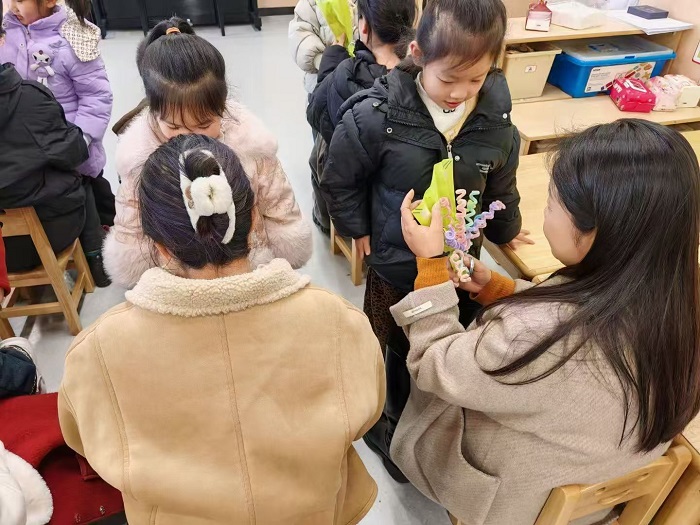 大班则推出扭扭棒花艺制作与“妈妈的专属礼服”亲子绘画两大特色活动。孩子们和家长一起弯折、缠绕扭扭棒,合力完成手工花;在绘画环节,亲子携手勾勒线条、填充色彩,共同设计专属礼服,用画笔描绘对妈妈、奶奶、外婆的爱与祝福,每一幅作品都饱含独一无二的温情。