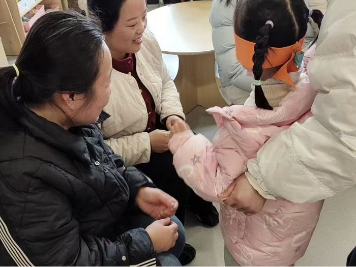 中班开展粘土花艺创作与“闭眼摸妈妈”亲子互动游戏。活动中,家长与孩子配合默契,一同在圆形画纸上用超轻粘土制作出一朵朵可爱的花朵,亲子协作间满是温馨。而在趣味互动游戏里,孩子们闭眼触摸家长的脸庞、双手,在亲密接触中感受亲情,现场氛围暖意融融。