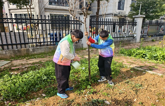 活动现场,小志愿者们身着色彩斑斓的志愿马甲,按步骤有序协作:先俯身细心挖土、整理树穴,再手持铁锹为新树苗培土夯实,最后提着水壶为树苗浇灌“生命之水”。从挖坑到浇水,每一步都认真细致,默契配合间,春日校园更添蓬勃朝气。