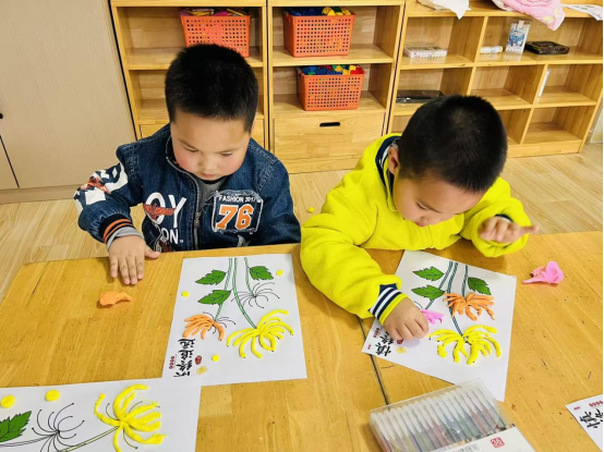 孩子们用彩纸撕贴、黏土塑形等方式,制作出一朵朵金黄的菊花。稚嫩的小手认真地撕、粘、揉、捏,将对先辈的敬意融入每一件作品,用创意传递着浓浓的思念。