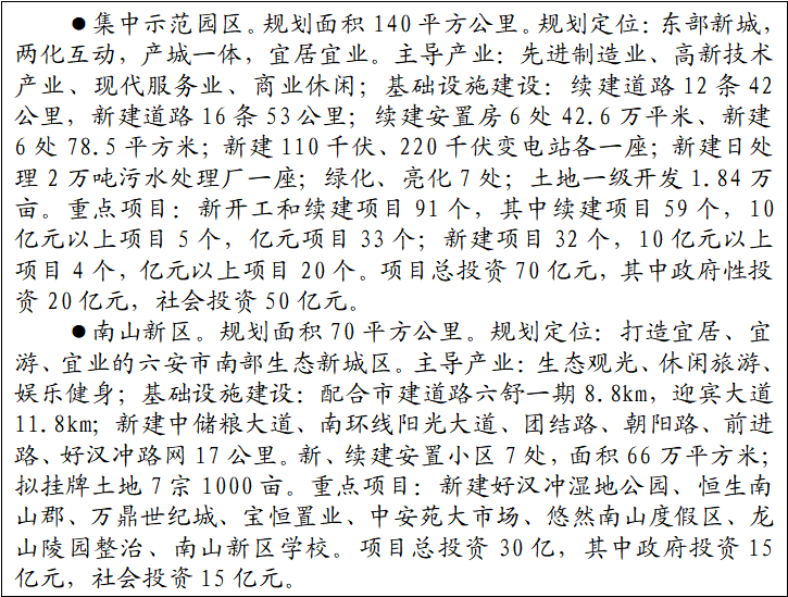 进一步抢抓机遇,明确发展区域和重点,整合资源,集全区之力全力打造东部新城、南山新区和城北工业园。一是加大基础设施投入,重点续建园区道路、管网、给排水,完善配套,拓宽成熟区面积。集中示范园区构筑80平方公里的路网骨架。2014年续建道路12条42公里,新建道路16条53公里,道路投资6.4亿元。重点建好寿春路、前进路、龙舒路、汉中路、一元大道北段、干渠南路等骨干道路,在园区形成六纵六横的路网系统。南山新区将规划“五纵五横”10条道路布局路网建设,拉开发展的框架。2014年依托六舒路、迎宾大道两条市建道路,重点建设中储粮大道、团结路、阳光大道、前进路、好汉冲路网、金裕大道、朝阳路,形成三个道路闭合区,其中市建道路20.6公里,区建道路长度17.8公里,区投资4.85亿元。城北工业园区2014年建设道路5条,续建纵一路、纵二路、霍邱路、新建吉宝大道、纵四北路。道路总长7.8公里,投资8000万元,将形成“八横五纵”的园区道路网。二是加大招商和重点项目建设,提高招商门槛,招大企业、大项目,以先进制造业、战略新兴产业、生态环保产业、物流、现代商贸为重点,实行驻点招商和重点招商;加大重点项目在建、续建、新开工项目调度,确保一批重点项目建成投入使用,增强对经济发展带动力。三是加大园区要素保障。在土地、资金、劳动力、融资等方面向三个核心发展区域倾斜。积极组建城北工业园融资平台。