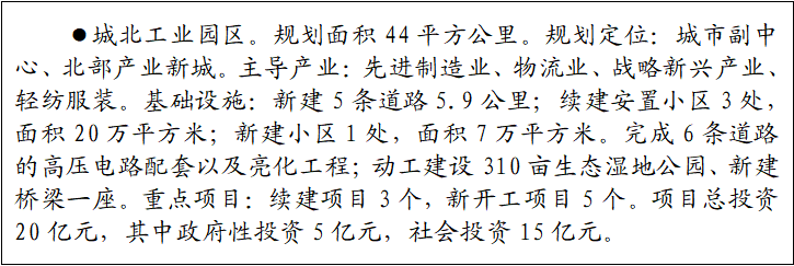 (一)加快工业经济发展步伐。围绕装备制造、新型材料、轻纺服装、农产品加工等主导产业和亿元企业进一步做大做强,全面启动新一轮工业大提升“三年行动计划”,引导重点企业加大投资力度,实现产品换档升级。 加快产业园规划建设,确保重大工业项目落地,规划城北工业园6平方公里工业用地,扩大孙岗、双河、椿树等乡镇工业园面积。加快在建工业项目的竣工投产,实现新增规模企业16家,实现规模工业产值200亿元,增加值46.5亿元。