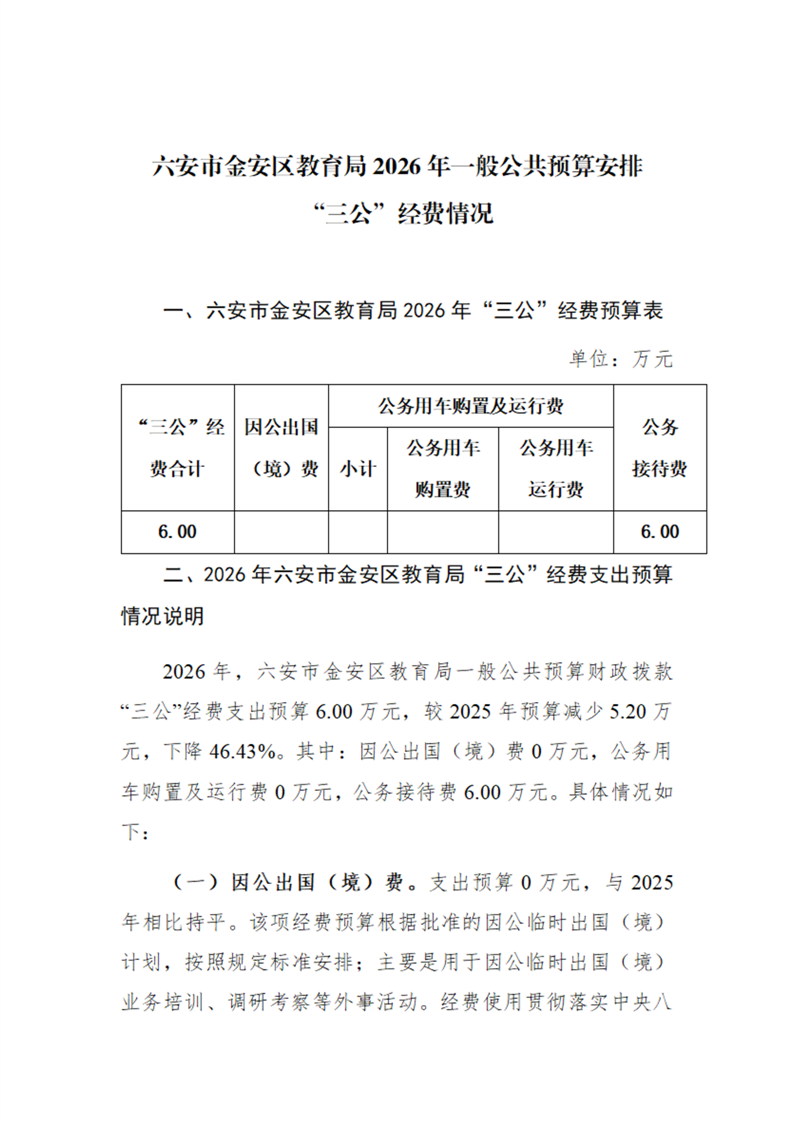 2026年六安市金安区教育局部门一般公共预算安排“三公”经费情况公开
