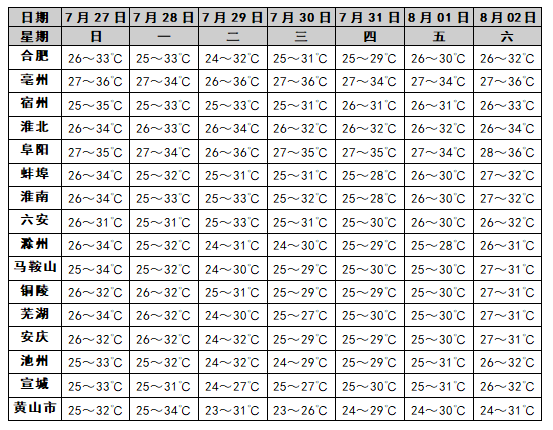 气温方面,27日至8月2日全省大部分地区高温天气有所缓和,仅淮河以北部分地区最高气温超过35℃。8月3日后全省高温天气再次发展,大部分地区最高气温35~38℃,其中淮北部分地区最高气温可达39℃以上。