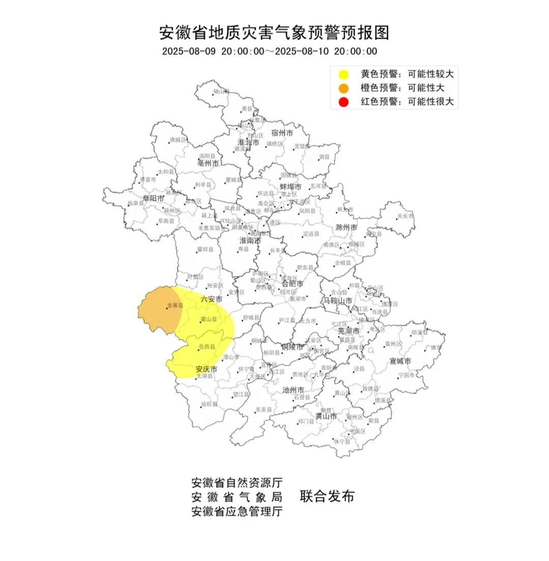 预计,2025年8月9日20时至8月10日20时,安庆市岳西县,六安市金寨县、霍山县发生山洪灾害可能性很大(Ⅰ级,红色预警);六安市金安区、裕安区、舒城县发生山洪灾害可能性较大(Ⅲ级,黄色预警)。其他地区也可能因局地短历时强降水引发山洪灾害。
