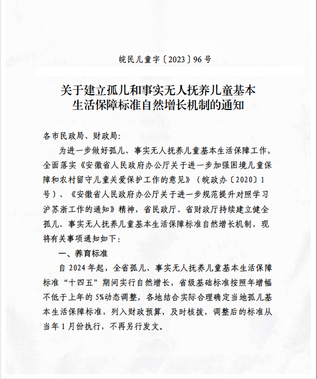 《关于建立孤儿和事实无人抚养儿童基本生活保障标准自然增长机制的通知》