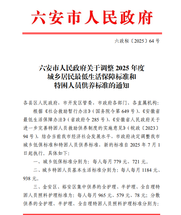 【标准】六安市人民政府关于调整2025年度城乡居民最低生活保障标准和特困人员供养标准的通知