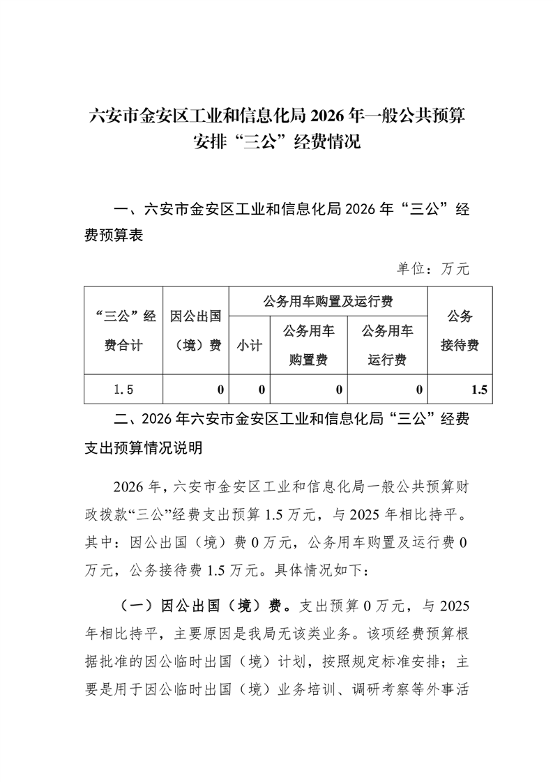 六安市金安区工业和信息化局 2026 年一般公共预算安排“三公”经费情况