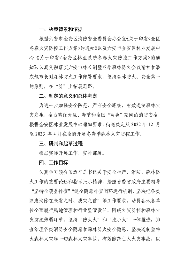 为进一步加强安全防范,严守安全底线,有效遏制森林火灾发生,全力确保元旦、春节和全国“两会”期间的消防安全,根据金安区林业发展中心通知要求,街道决定从2022年12 月至2023 年4月在全街开展冬春季森林火灾防控工作。