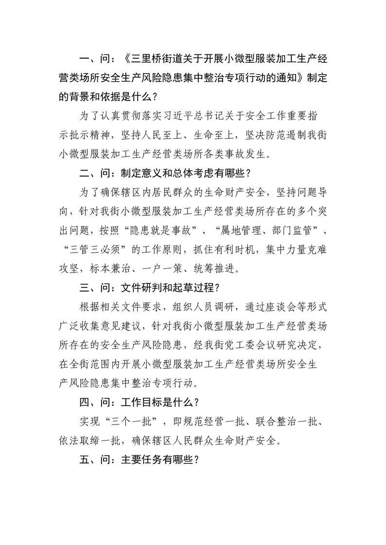 【政策问答】《三里桥街道关于开展小微型服装加工生产经营类场所安全生产风险隐患集中整治专项行动的通知》政策解读.doc