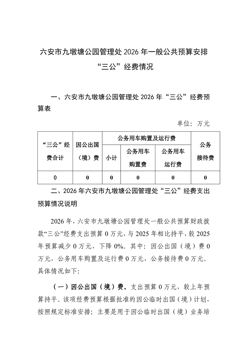 2026年六安市金安区九墩塘公园管理处单位一般公共预算安排“三公”经费情况