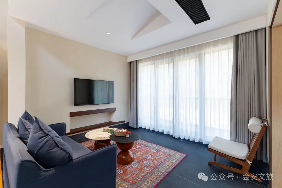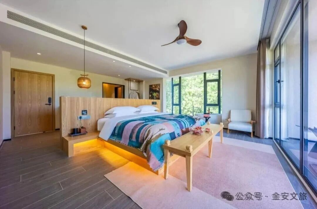 民宿仅有14间客房,每一间都是设计师的匠心独运。50㎡+的宽敞空间,让你可以尽情舒展身心。全屋配备智能设备,从智能窗帘、智能马桶,再到贴心的小度语音助手,科技感与自然美学在此完美交融。当清晨的第一缕阳光洒进房间,智能窗帘缓缓拉开,映入眼帘的是漫山遍野的翠绿,闭上眼睛,还能听见清脆的鸟鸣,疲惫的身心也在这山野清风中渐渐苏醒。