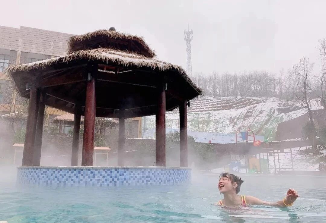 这一泓清澈爽滑的山间温泉啊,胜似可相忘于红尘的美好之地。若是再下点小雪就更美了,目光所及是廊亭草屋外的白雪飘飘,身心却包裹在这一潭温暖氤氲之中,好不惬意、潇洒、浪漫。