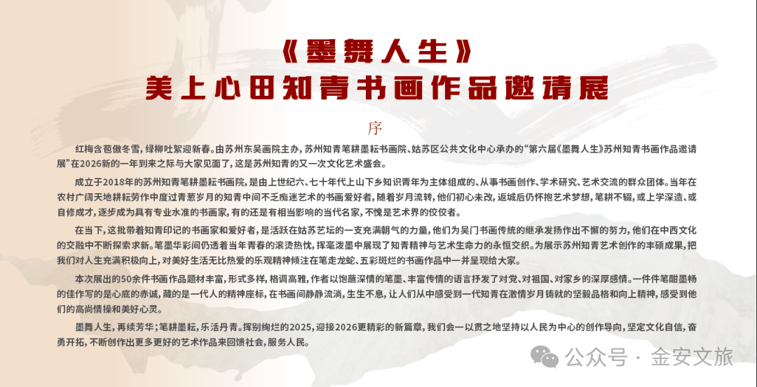 本次展览由苏州东吴画院主办,苏州知青笔耕墨耘书画院、基业田园美术馆、安徽省小禾有生农业发展有限公司联合承办,是一场凝聚着岁月温度与艺术力量的展览。