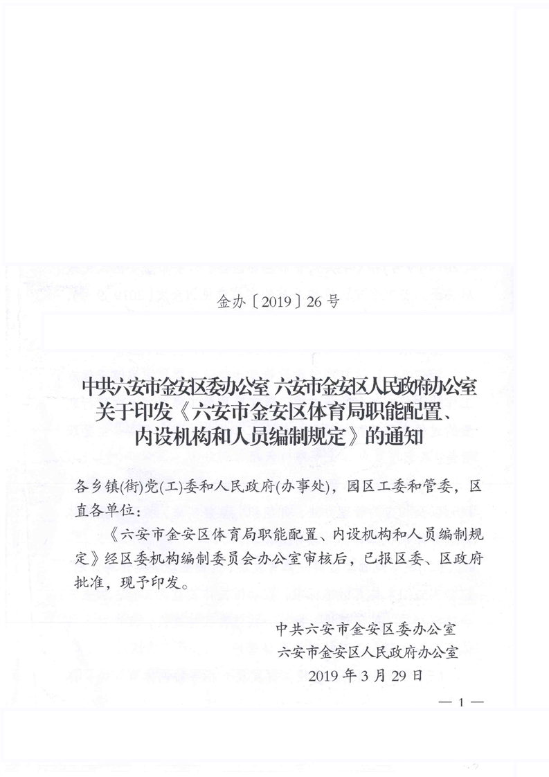 关于印发金安区体育局职能配置、内设机构和人员编制的通知
