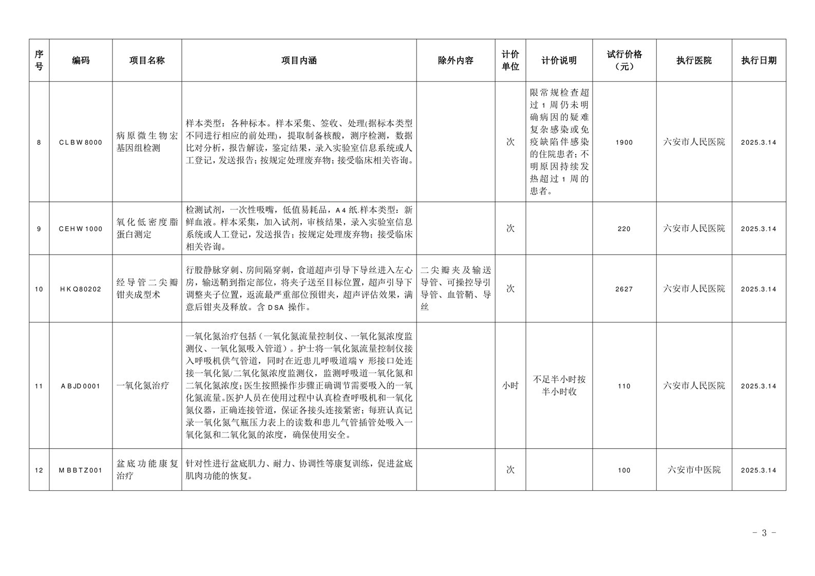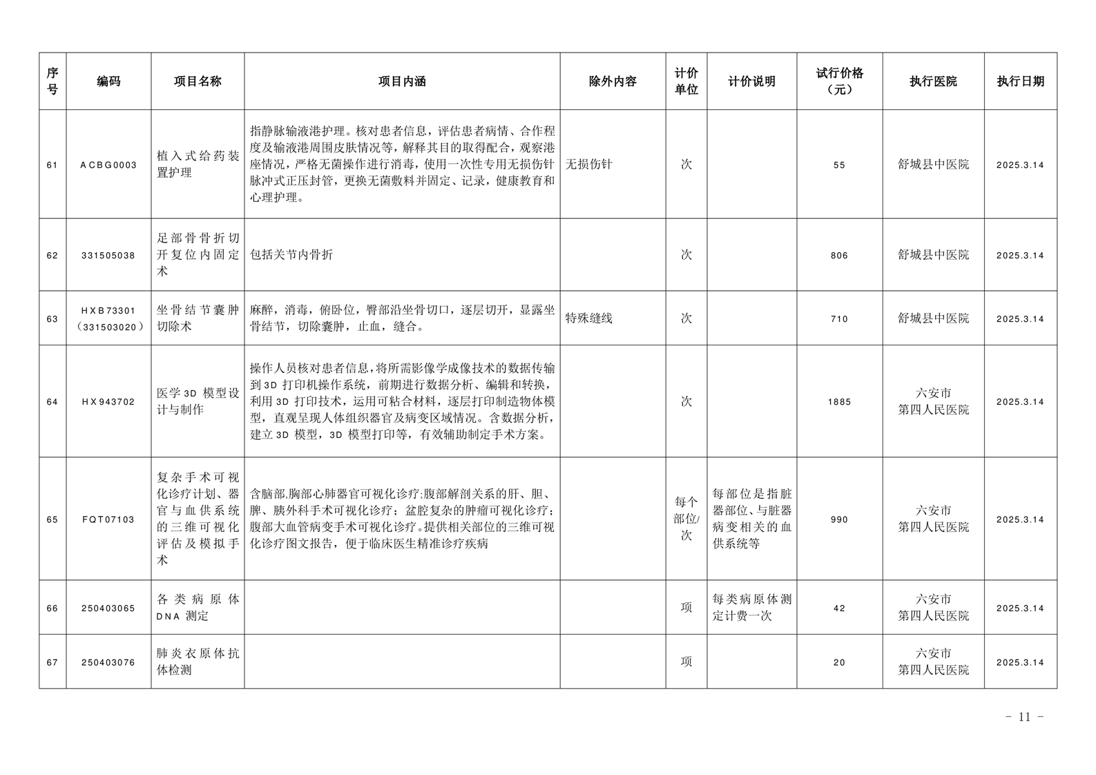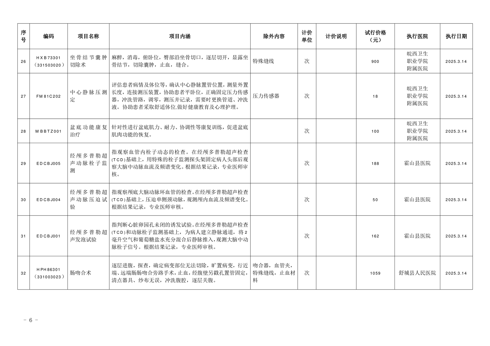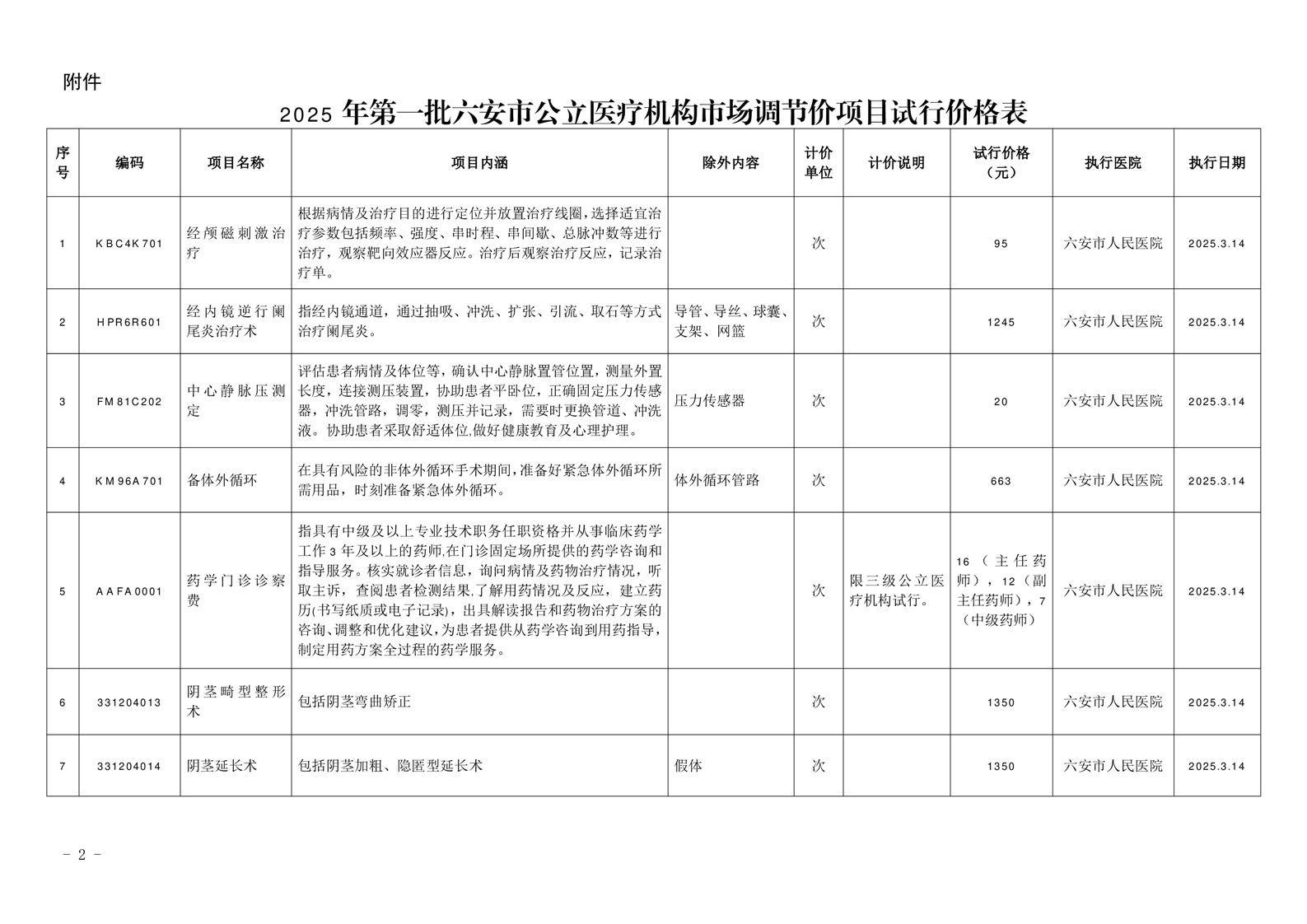 【重要商品服务价格】【医疗服务】2025年第一批六安市公立医疗机构市场调节价项目试行价格