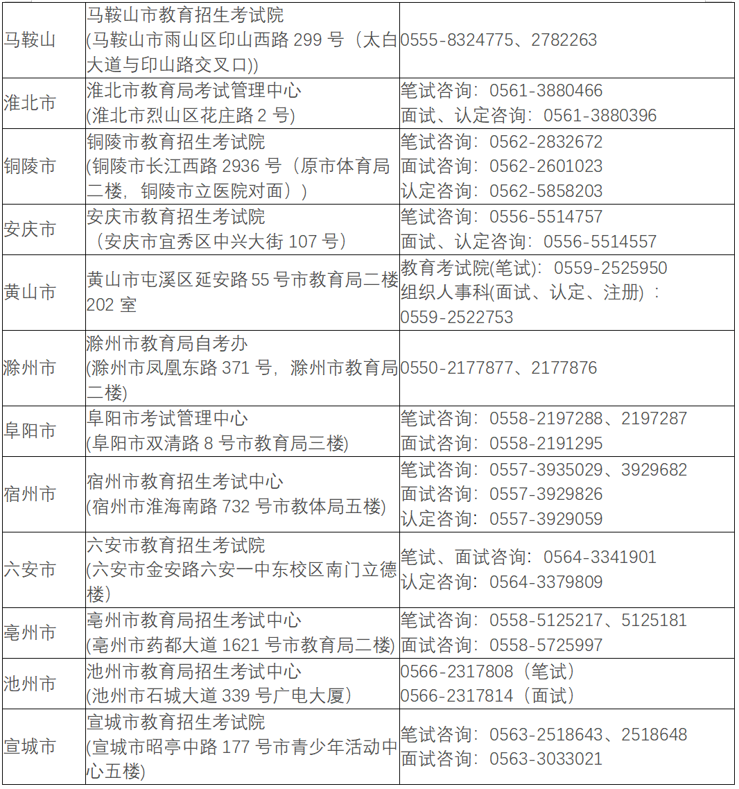 安徽省2025年上半年中小学教师资格考试笔试报名网上审核各市联系方式