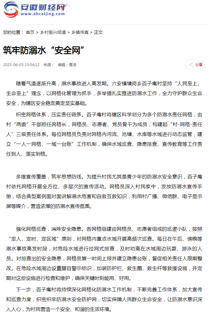 【媒体解读】安徽财经网对横塘岗乡防溺水工作进行报道解读