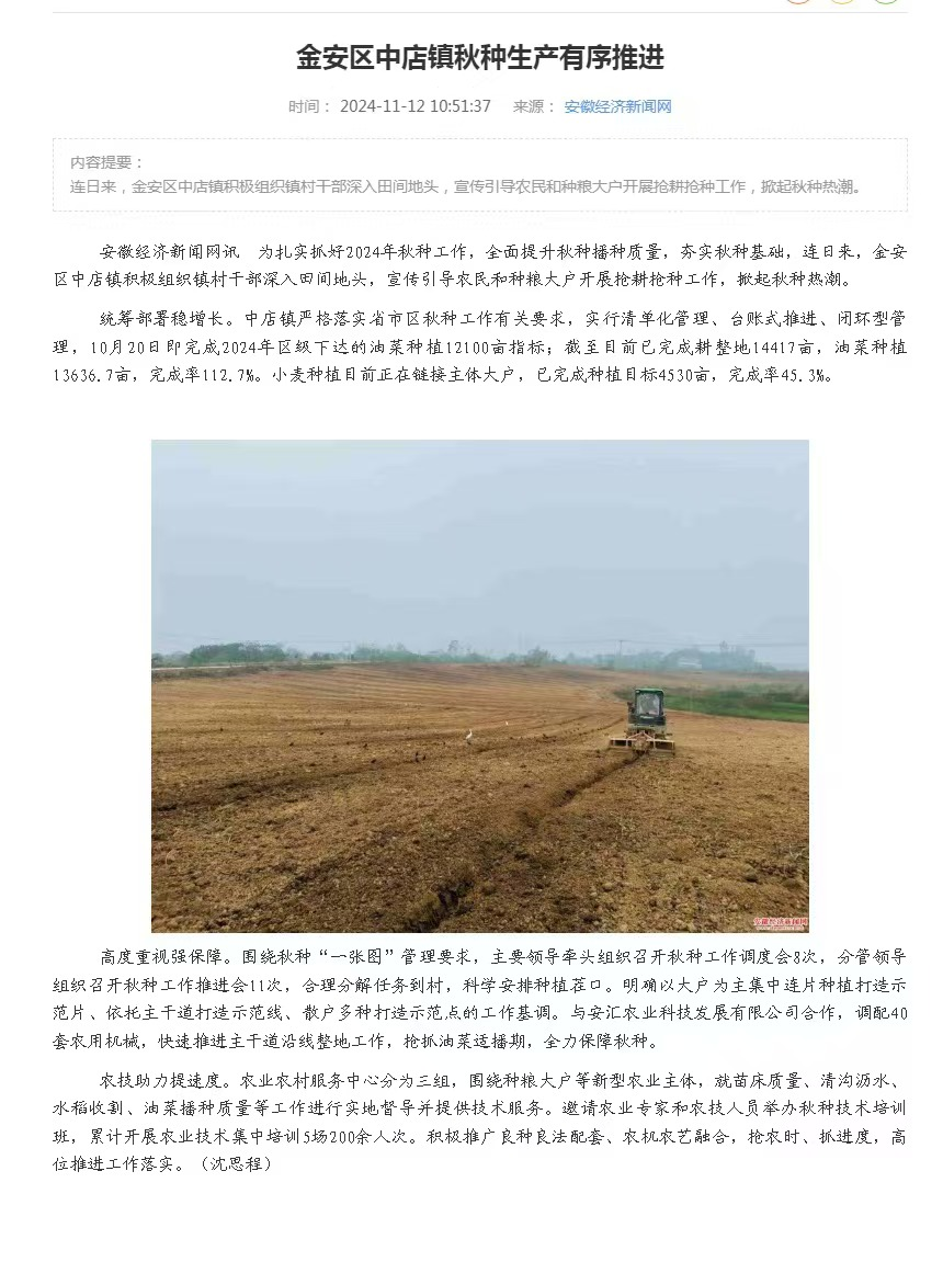【媒体解读】安徽经济新闻网对中店镇秋种工作进行报道解读