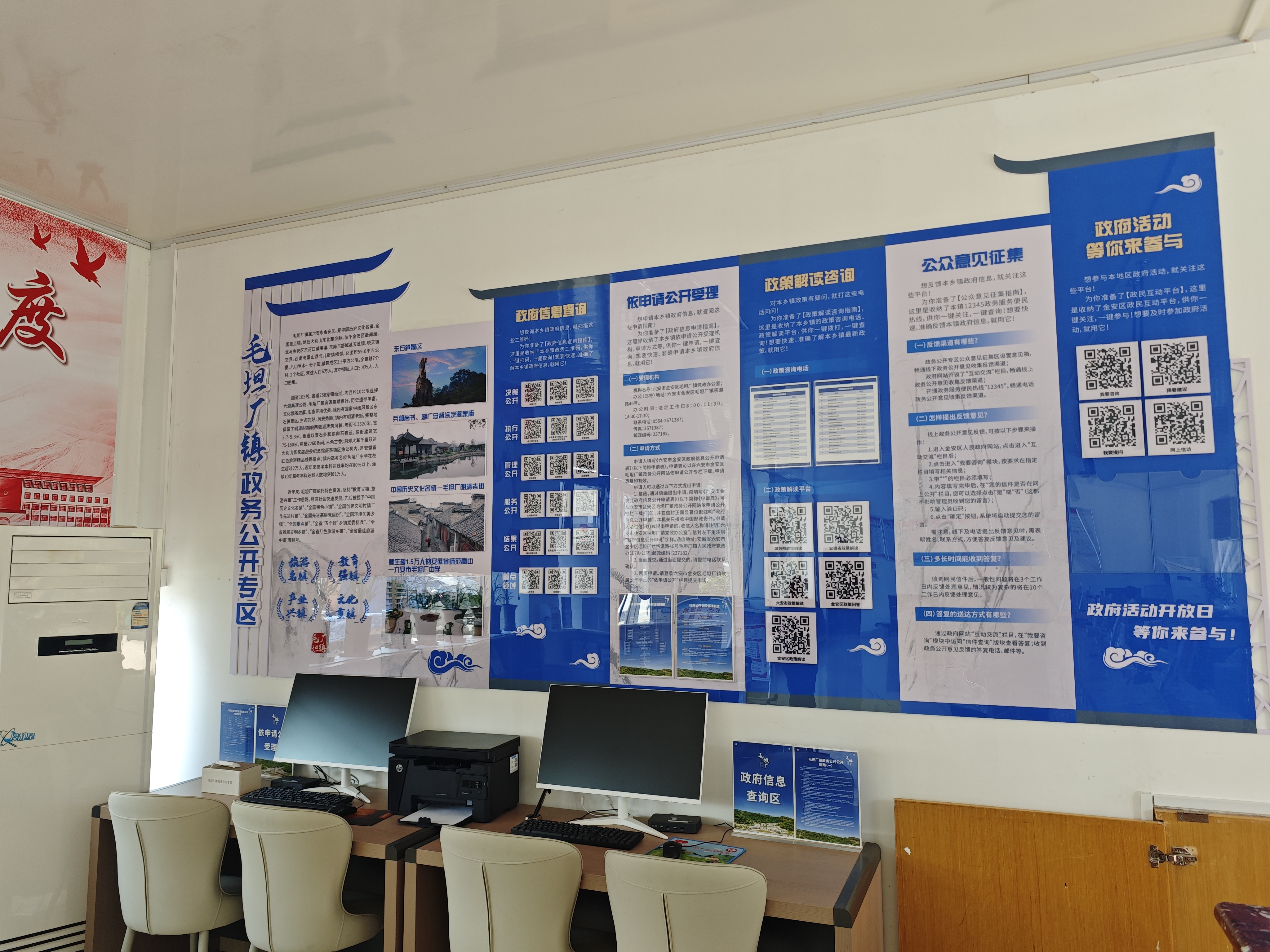 金安区毛坦厂镇积极推行政务公开“零距离”服务,在镇便民服务中心设立标准化、规范化政务公开线下专区,面积约20平方米,配备了咨询台、便民柜、桌椅及查询办理一体机,为群众提供政府信息查询、信息公开申请、办事咨询答复等服务,打通了服务群众“最后一公里”,切实提高政府信息的知晓度,保障群众知情权。