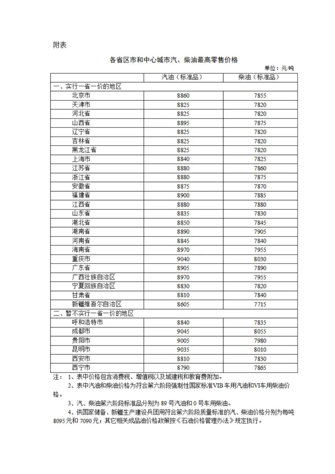 附:各省区市和中心城市汽、柴油最高零售价格