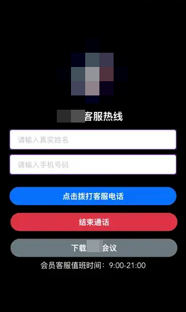 有市民点击链接后,便跳转到了某平台客服热线页面。该页面上要求填写名字、电话,还有拨打客服电话、结束通话、下载会议APP等按键。