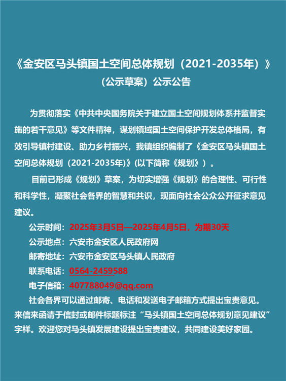 《六安市金安区马头镇国土空间规划划(2021-2035年)》批前公示,公示期为2025年3月5日——2025年4月5日。