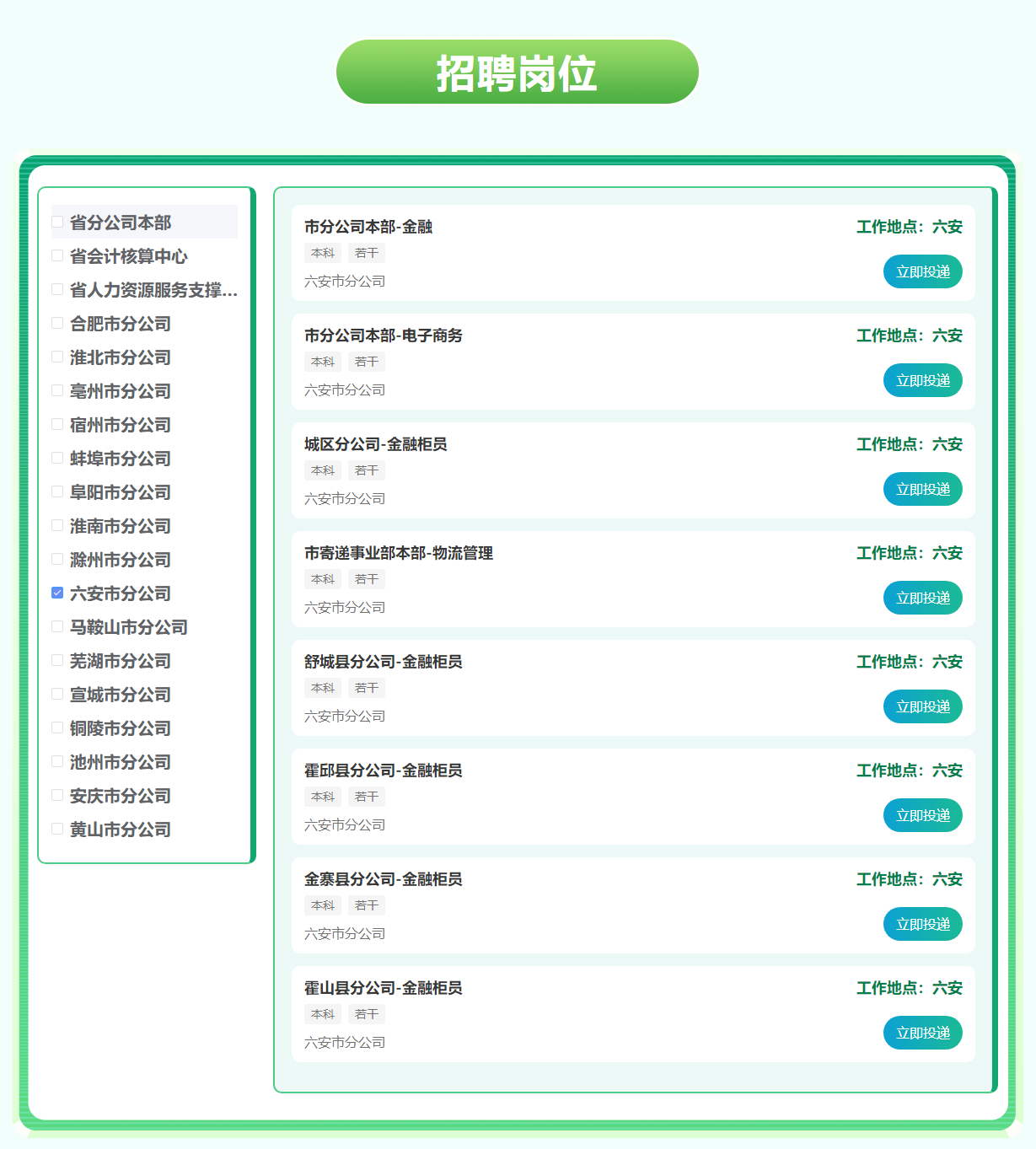 近日中国邮政集团有限公司安徽省分公司发布2026年度春季校园招聘公告 其中六安市分公司招聘多个岗位涉及金融、电子商务、金融柜员、物流管理等招聘专业要求:经济学、理学、工学、管理学等相关专业更多招聘要求一起来了解下