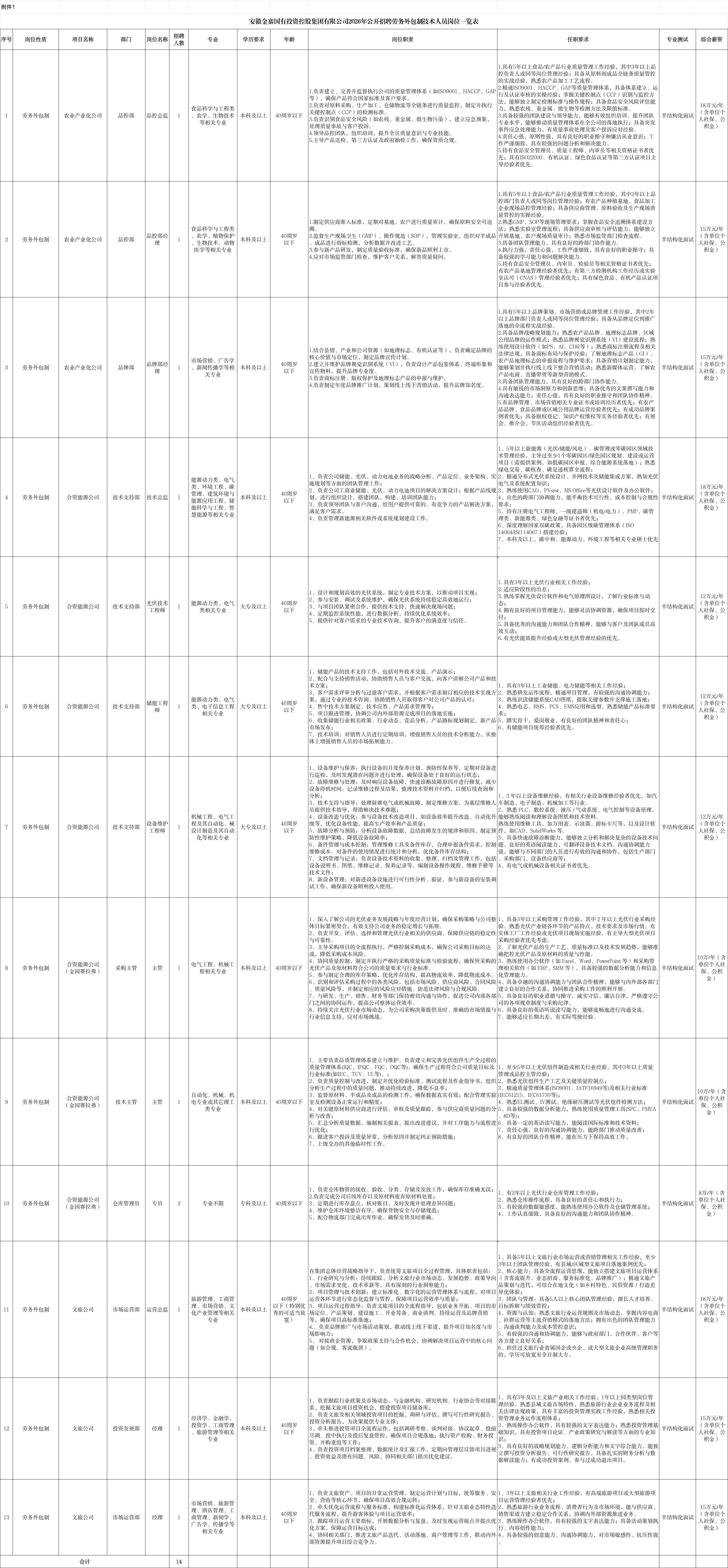 计划招聘劳务外包制技术人员14名(具体计划见附件1)。