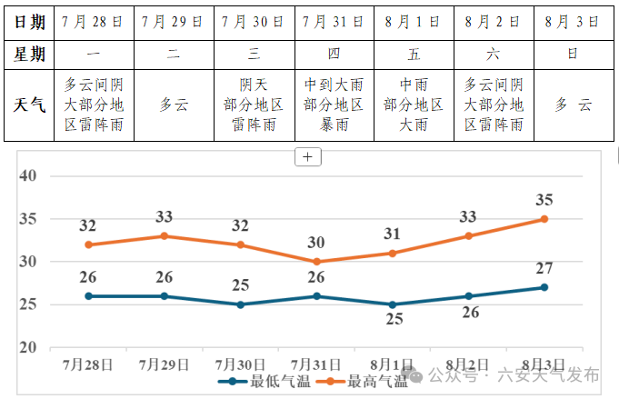 气温预报:28日至8月4日全省大部分地区高温天气缓和,仅淮河以北部分地区最高气温超过35℃。